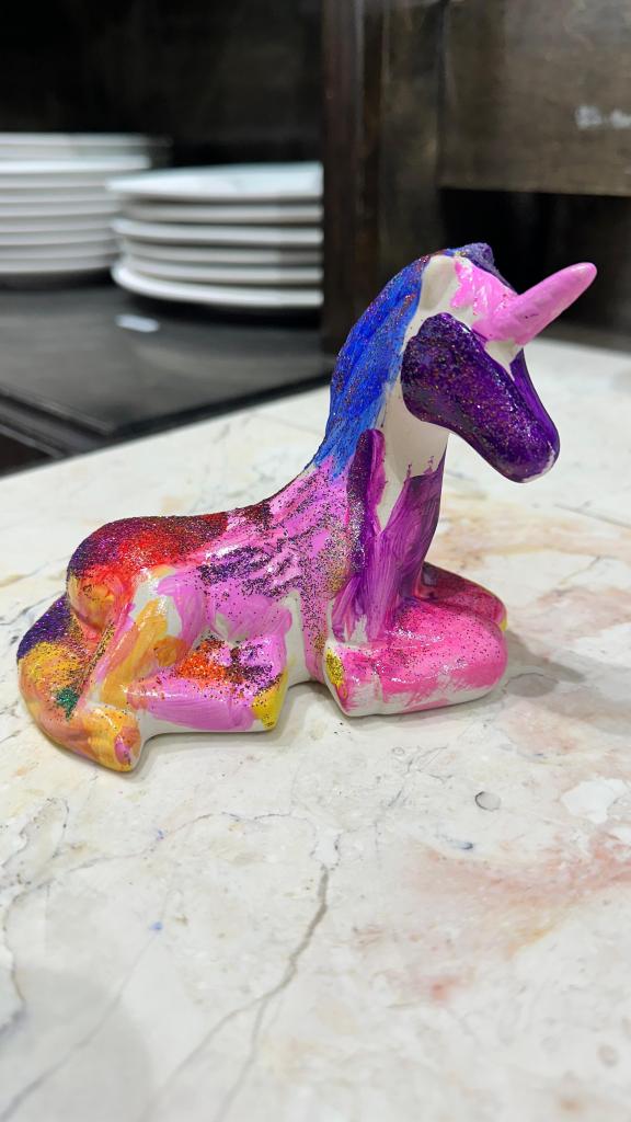 They choose their pieces carefully, almost as if selecting a tattoo or a treasure: something that will accompany them, a memory of love, a family keepsake, an object charged with future. There is a four-year-old girl who visits me almost every Tuesday after her swimming class. Her father brings her, and together they take the day’s choice very seriously: a mug, a unicorn, a tiny house. Her pieces are, so far, my favorites. The freedom with which she chooses colors and immerses herself in painting amazes me. There is no judgment—only form, emotion, and play. She has told me she already has a small exhibition space reserved just for her pieces.